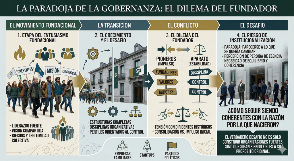 Pero cuando la organización crece, la lógica cambia. Aparecen responsabilidades institucionales, estructuras más complejas y la necesidad de disciplina organizativa. El liderazgo empieza entonces a rodearse de perfiles más orientados al control del aparato que al impulso fundacional.